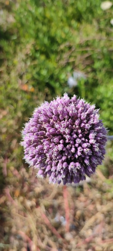 A peine avions-nous dépassé la première plage de galets que nous avons pris à travers la prairie, plus haute que la plage d’un bon mètre. Là, de gros bourdons s’agglutinent par grappes sur des fleurs des champs. Ici une fleur énorme d’ail d’ornement. Au retour, on a vu que les bourdons semblent s’arrêter là pour y passer la nuit, serrés à plusieurs sur les fleurs pouvant en accueillir cinq ou six.