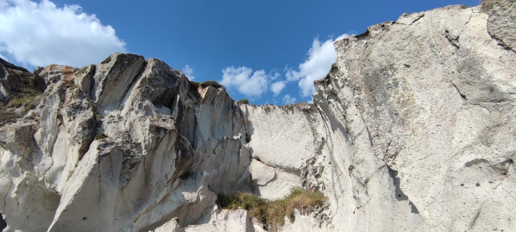 Pendant qu’on évolue dans de très gros blocs de roche volcanique rouge brune, on perçoit un peu plus loin que celle-ci cède peu à peu du terrain aux roches blanches.