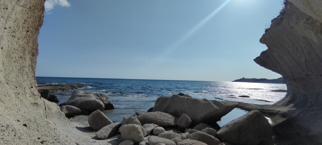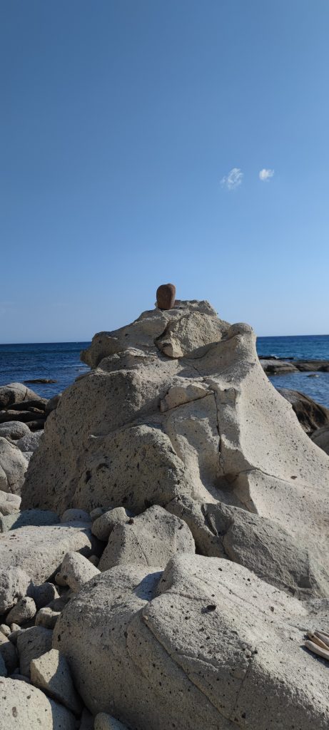 A son pied, on se faufile entre l’eau et la roche. L’absence de marée transforme cette balade en un jeu dans lequel tout danger est écarté : mettre les pieds dans l’eau ou passer sans la toucher en traversées sur la roche ? A chacun sa règle.