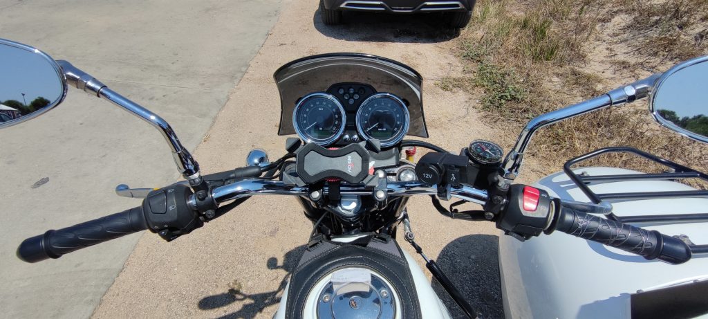 Un chouette garage moto, le mécano essaie de sauver la prise en soufflant de l’air dedans, en y envoyant du nettoyant contacts, rien n’y fait. Il nous conseille de tenter d’en trouver un neuf au méga bazar chinois, en ville… et là bingo, il n’en restait plus qu’un, qu’on emporte pour 9,90 euros et quelques connecteurs rapides pour l’adapter au circuit de la Guzzi.