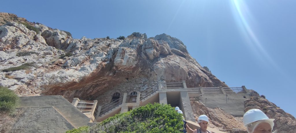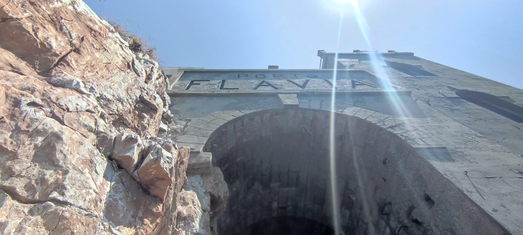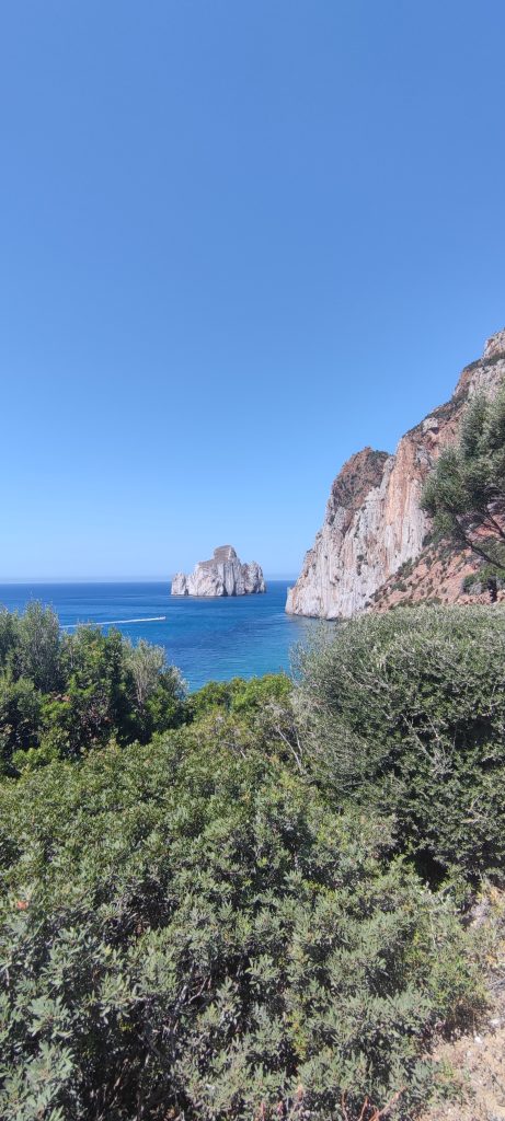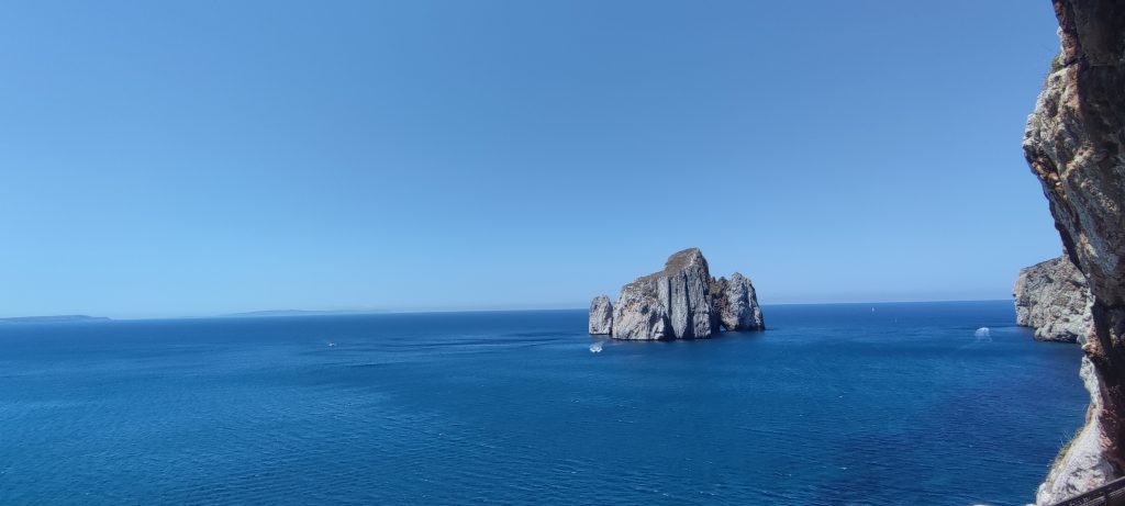 Au détour d’un virage on aperçoit le fameux « Pain de sucre », repère visuel qui permet de situer la galerie de sortie du minerai de la mine taillée dans la falaise de Porto Flavia. Cette mine a été créée puis exploitée par la société belge Vieille Montagne dans les années 1920.