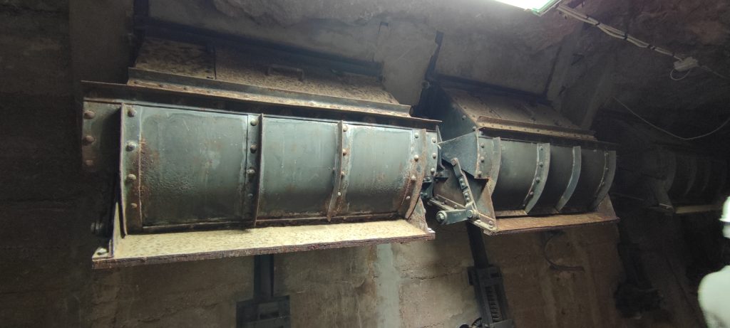 Ici on voit deux trappes sous les silos, permettant de remplir les wagonnets jusqu’à la rampe de déchargement.