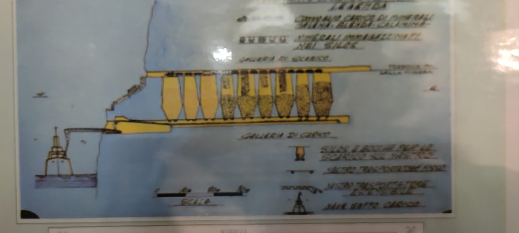 Grâce à un dispositif astucieux de stockage du minerai extrait, à l’intérieur même de la montagne dans plusieurs silos énormes, celui-ci peut être acheminé par wagonnets sur rails et déversé directement dans les cales des bateaux qui se placent sous le bras articulé à la sortie du tunnel.