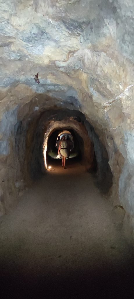 Nous descendons par les escaliers à flanc de falaise, jusqu’au second tunnel qui correspond au bas des silos remplis de minerais…