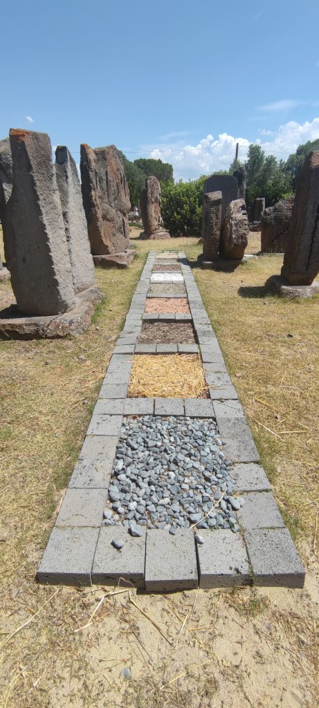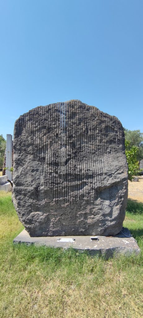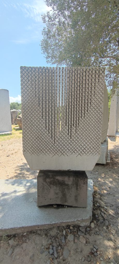 Dans une vidéo sur Pinuccio Sciola, on voit l’artiste manipuler ses pierres, schiste, granit, calcaire, du bloc brut au bloc passé par ses mains, et sous les griffures et entailles d’une lame rotative au diamant, il raconte comment son enfance au contact du travail de la terre, immergé dans la culture Sarde, dans la mémoire des traditions Nuragiques, l’ont amené à s’occuper des pierres… Cet assemblage est un hommage.