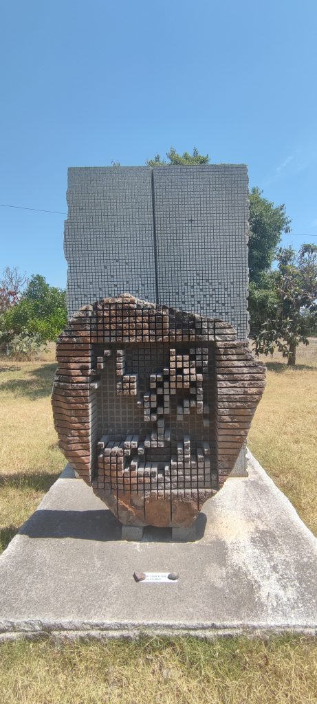 Dernière image du musée à ciel ouvert Pinuccio Sciola, qui s’est éteint le 13 mai 2016 à Cagliari. On y reconnaît une sculpture avec trois sujets humains : deux adultes et un enfant.