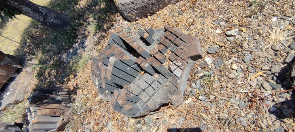 Ces deux pierres latérales, blocs carrés placés debout, sont déchirés non par une lame au diamant, mais par le feu d’un chalumeau faisant fondre cette pierre de lave, qui retourne à son origine plasmatique en coulant en quelques gouttes épaisses.